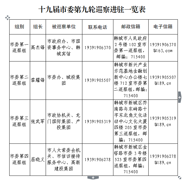 经市委批准,十九届市委第九轮巡察工作授权成立4个巡察组,对市委办、市人大常委会机关、市政府办、市政协机关、市信访接待服务中心、市国资事务中心等6个部门单位党组织和城投集团、产投集团、高新建投集团、龙门国际集团、韩城宾馆等5个市属国有企业党组织开展常规巡察,对市委办、市人大常委会机关、市政府办、市政协机关、市信访接待服务中心、市国资事务中心等6个部门单位党组织同步开展选人用人工作和意识形态工作责任制专项检查。